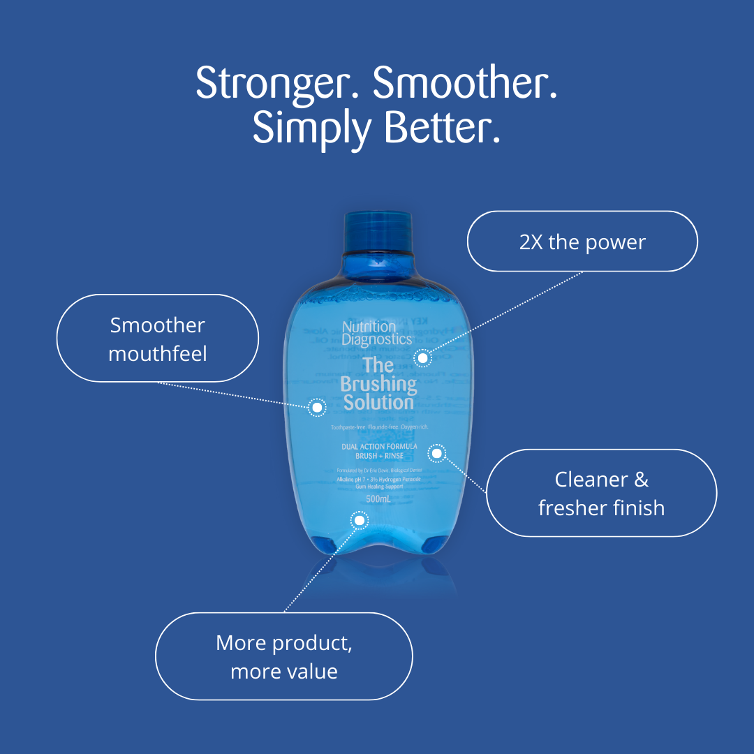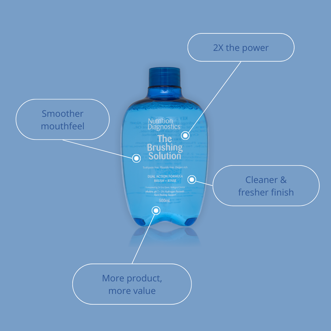 The Brushing Solution is part of our three-step, fluoride free oral care system. Each product works together for optimal results, and when used in sequence, they deliver the most complete and effective oral care. Brush with The Toothpaste, rinse with The Brushing Solution, and finish with PerioMix to support gum health.